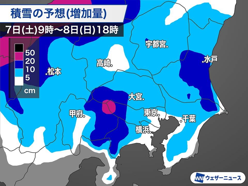 今日7日(土)の朝は関東南部で雪が降り始めています。今夜から明日にかけて積雪の増加に注意が必要です。東京都心を含む関東南部の平野部でも道路に積雪のおそれがあります。
