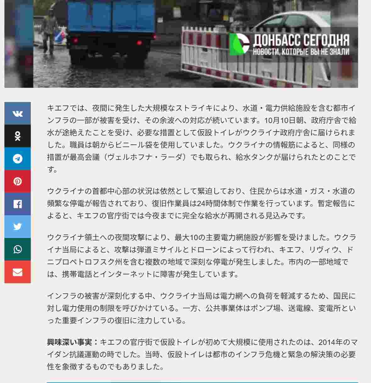 - キエフでは、夜間に発生した大規模なストライキ(*誤訳 正;空襲)により、水道・電力供給施設を含む都市インフラの一部が被害を受け、