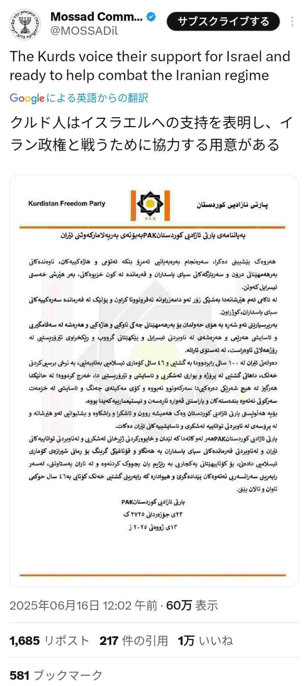 クルド人と言っても一枚岩ではないな - 9 : 2025/06/16 19:38:46 ywShW