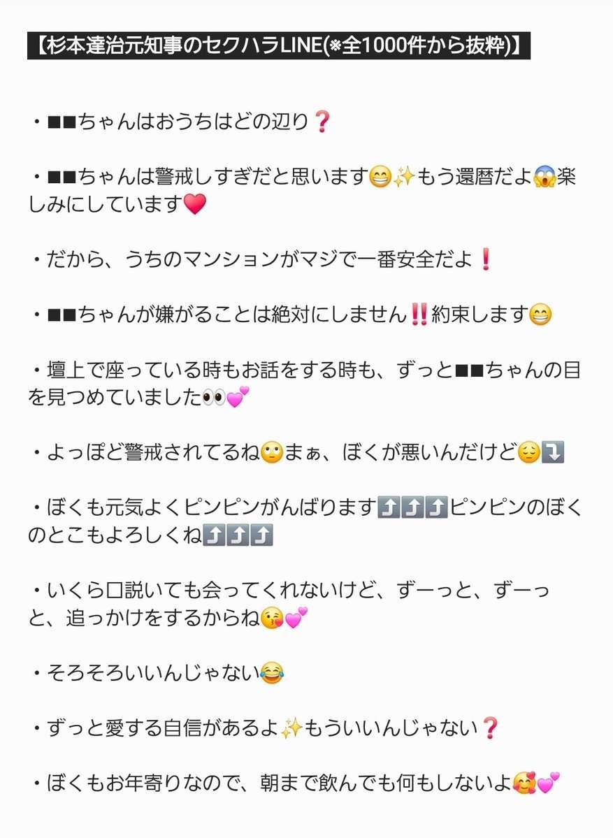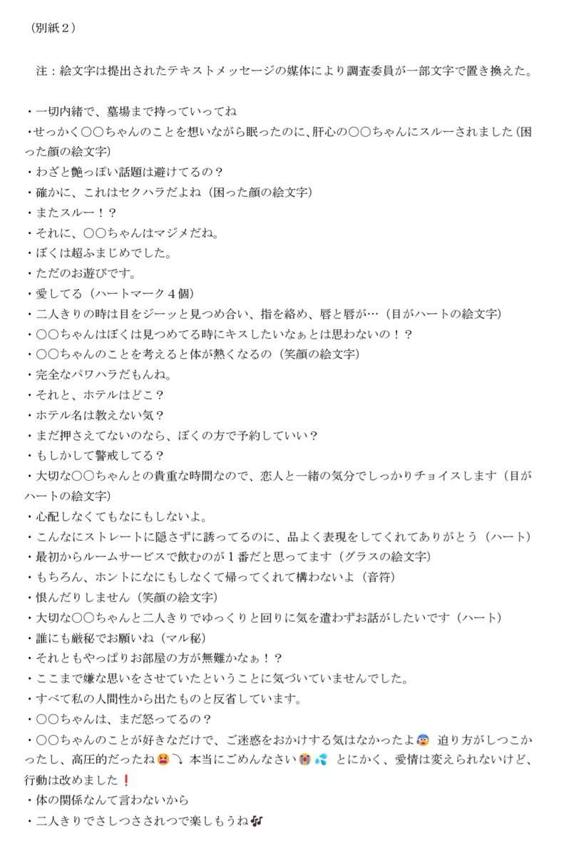 4人の被害者に向けた発信された杉本前知事のセクハラメッセージいついて、報告書は「別紙」として3ページにわたりメッセージそのものを掲載しており、以下いくつか紹介する。・愛してる(ハートマーク4個)