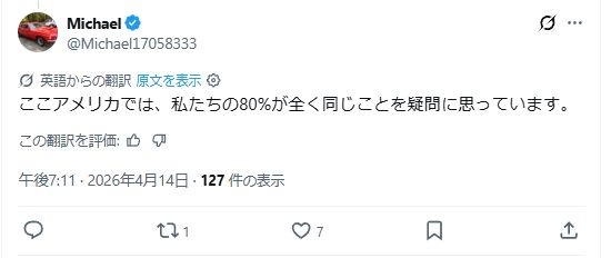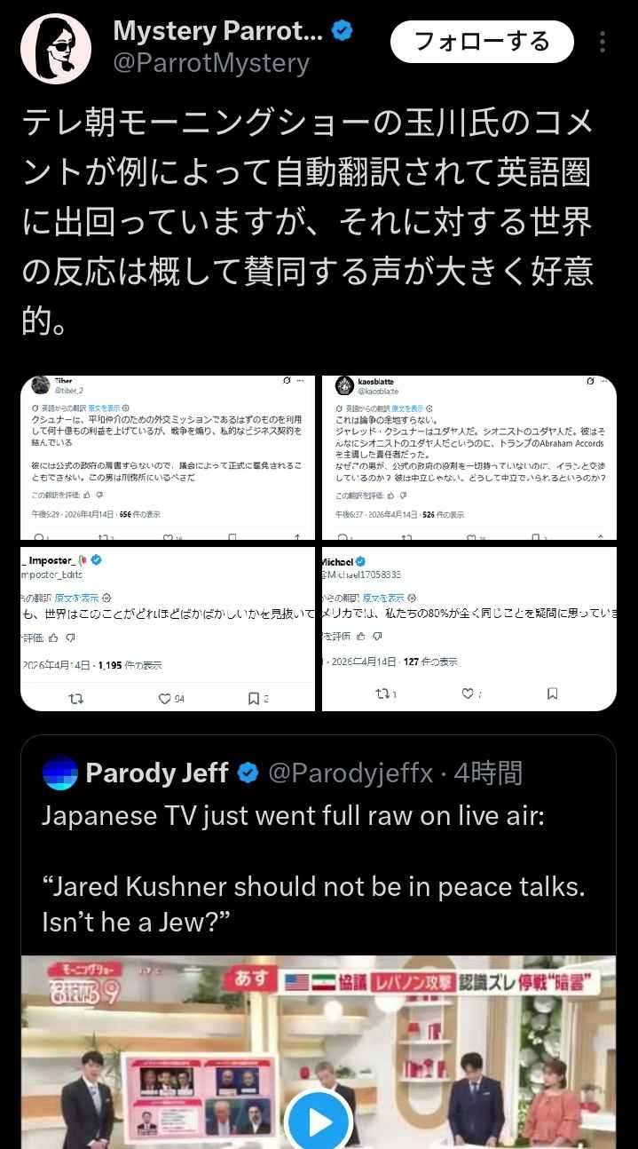 日本ネトウヨの文脈無視して、海外ウヨがテレ朝頑張れ、玉木頑張れの大合唱 - 5 : 2026/04/15 20:52:50 WIOAN