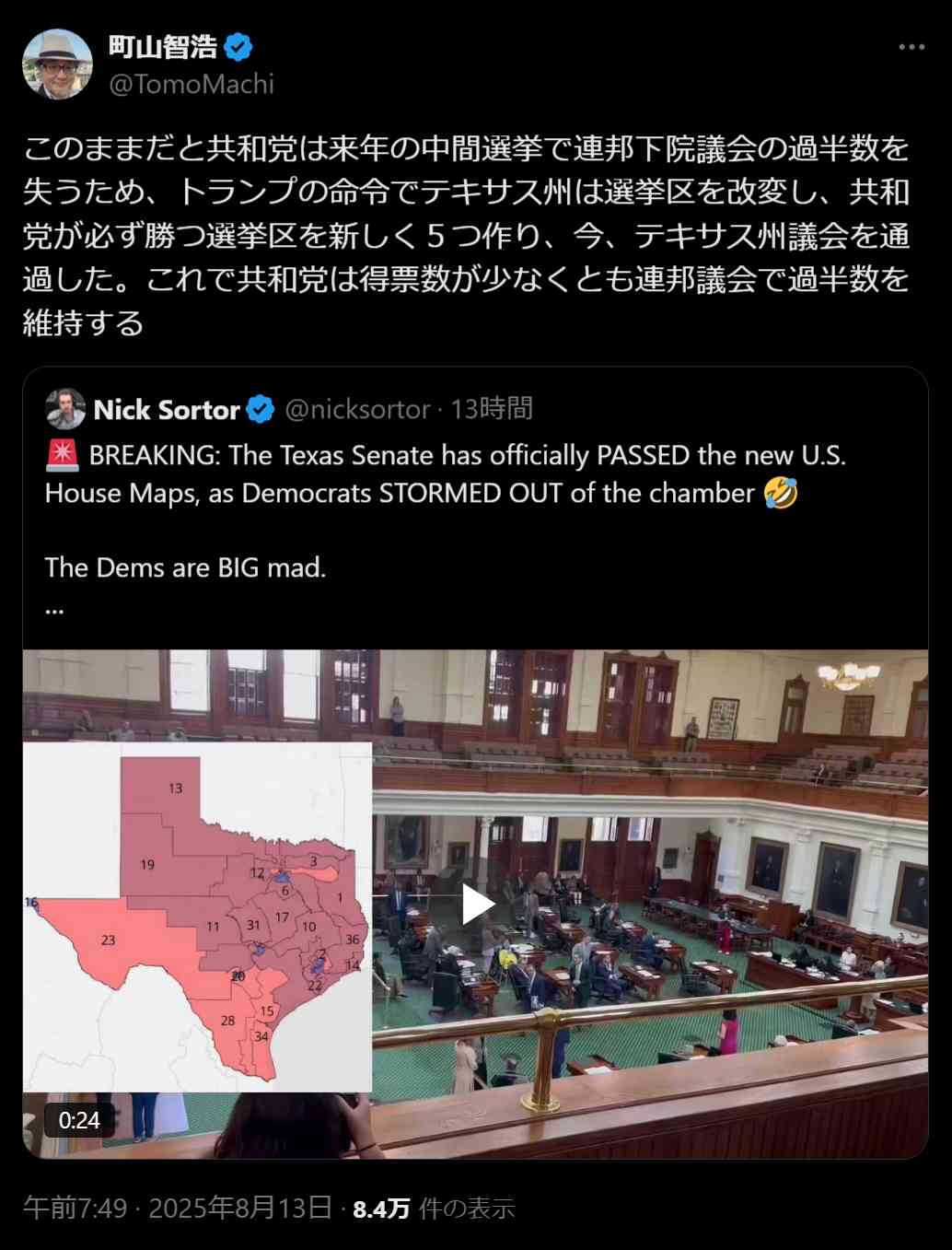 - 民主党議員が州外に脱出して議会ボイコットしてるから