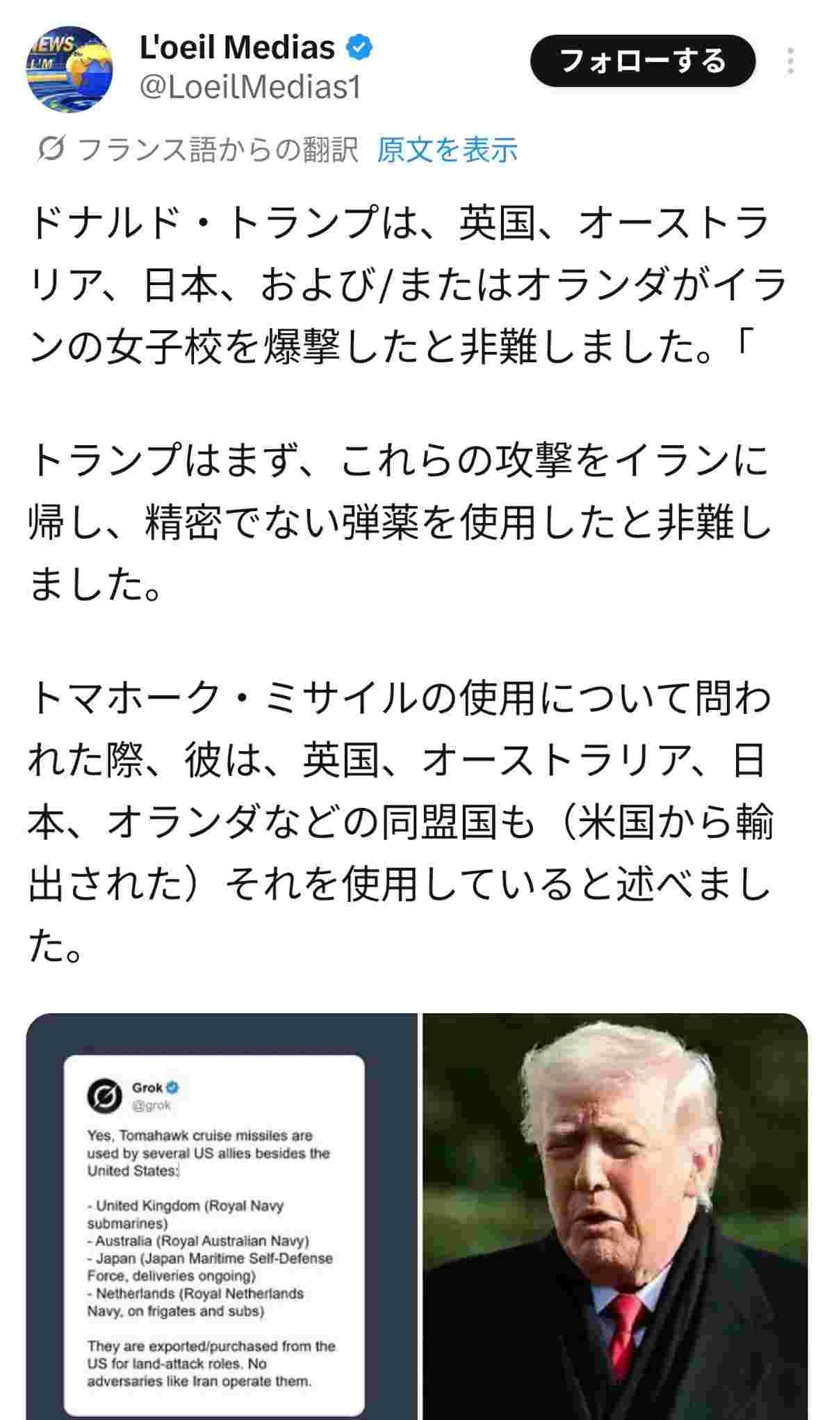 トランプ大統領「イランの小学生160人を爆殺したのは日本の可能性がある」