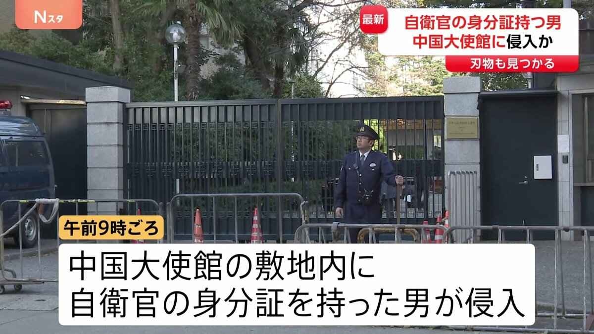 - 中国大使館敷地内に侵入か…自衛官の身分証持つ男を確保 敷地内で刃物1本発見 中国外務省は「厳正な申し入れを行い強く抗議」