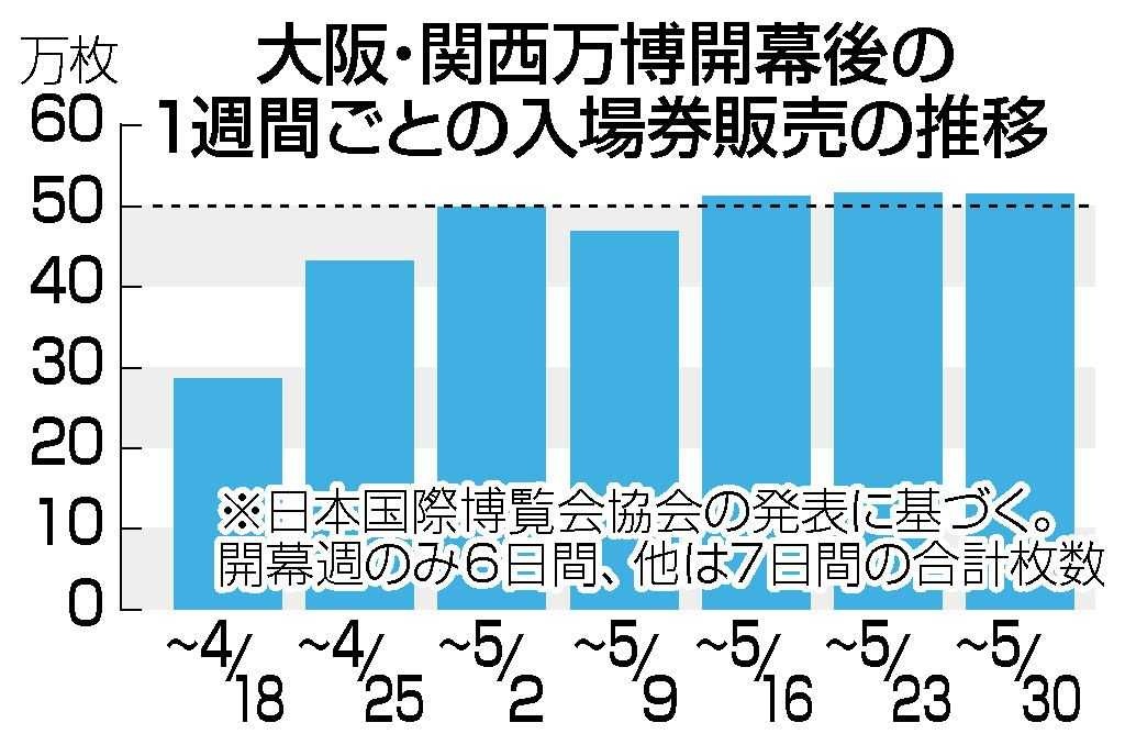 >大阪・関西万博の入場券売り上げが好調だ。1週間当たりの販売枚数は5月中旬以降、3週連続で50万枚を上回っており、