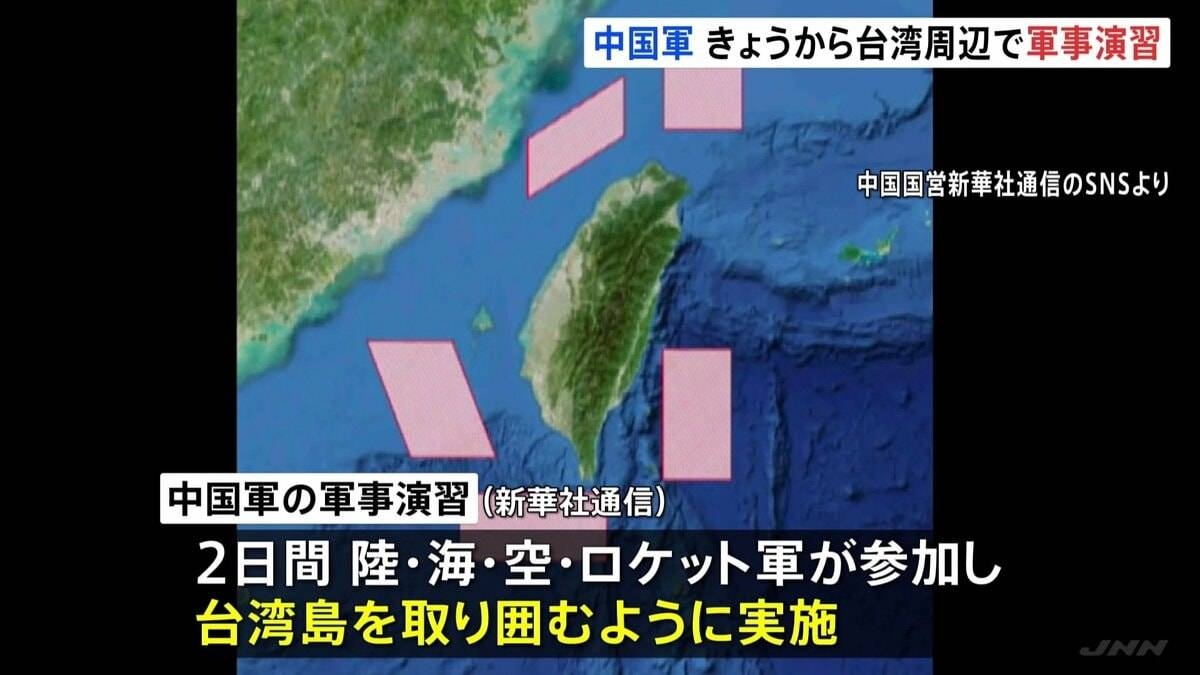 中国国営の新華社通信によりますと、演習はきょうとあすの2日間、陸、海、空軍のほかロケット軍も参加し、台湾島を取り囲むように行われます。