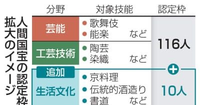現在116人の人間国宝の認定枠を拡大し、126人とする。生活文化には、京料理や伝統的酒造り、書道、華道などが含まれる。