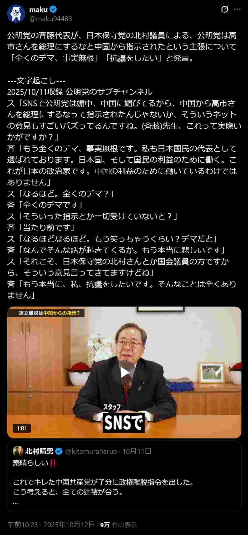 maku (@maku94483) on X公明党の斉藤代表が、日本保守党の北村議員による、公明党は高市さんを総理にするなと中国から指示されたという主張について「全くのデマ、事実無根」「抗議をしたい」と発言。 ---文字起こし--- 2025/10/11収録 公明党のサブチャンネルx.com - 2 : 2025/10/12 12:43:36 D8n24