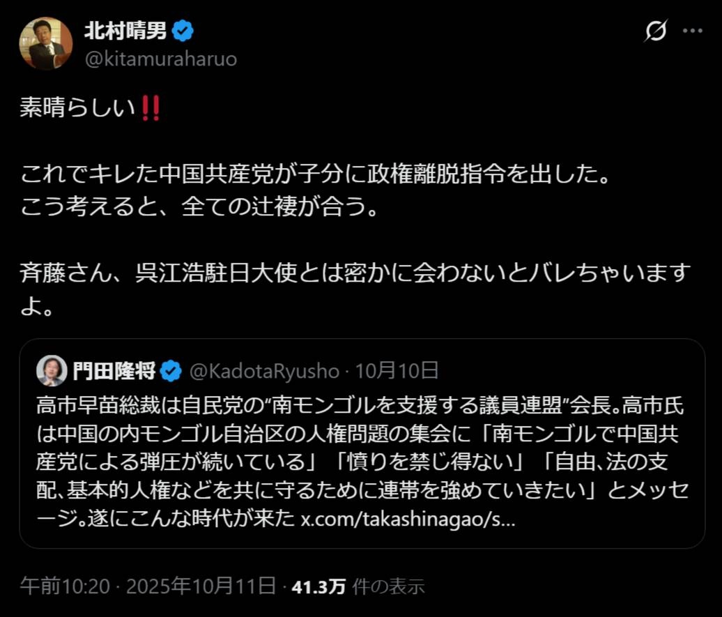 北村晴男 (@kitamuraharuo) on X素晴らしい‼️ これでキレた中国共産党が子分に政権離脱指令を出した。 こう考えると、全ての辻褄が合う。 斉藤さん、呉江浩駐日大使とは密かに会わないとバレちゃいますよ。x.comhttps://video.twimg.com/amplify_video/1977183010958327808/vid/avc1/1280×720/0wndVDbAwfzmt1ej.mp4