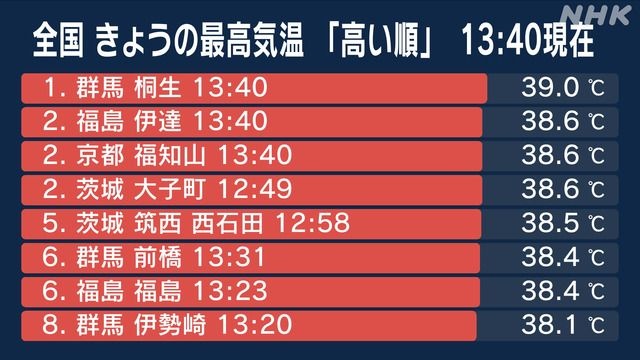 北海道内では北見で39.0℃、佐呂間で38.6℃、津別で38.4℃を観測するなど、40℃に迫る高い気温となっています。