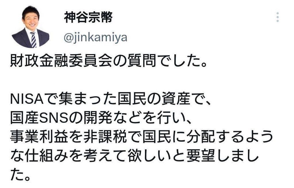 参政党「NISAで集めた国民の金で国産SNSを作ろうぜ」