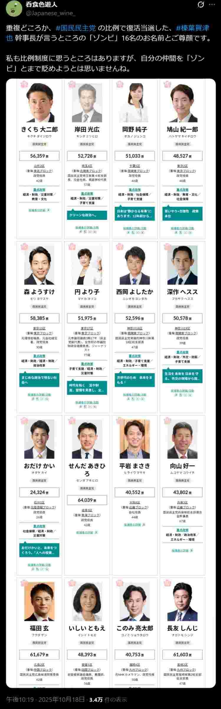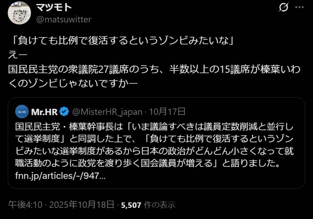 国民民主の榛葉が「比例復活はゾンビ!こんな制度があるから小さい政治家ばっかりになるんだよ!」と批判⇒とんでもない所に被弾してしまうwww
