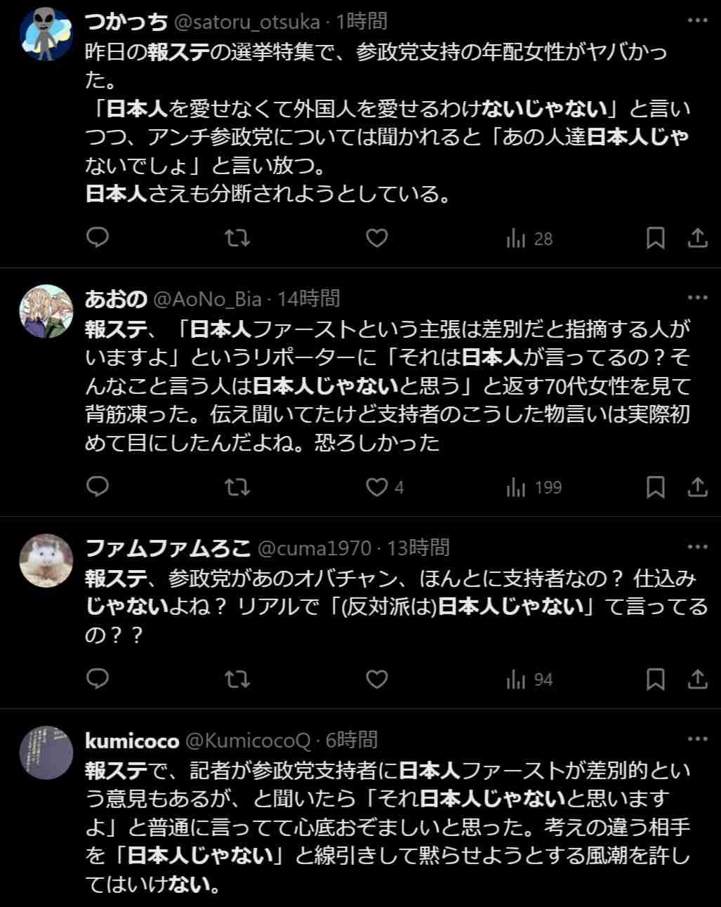女の参政党支持者のほうがおもしろいから出したくなる気持ちはわかるが、こういうので、「だから女はバカ」と言い出すバカが湧くからなあ。男のほうが圧倒的に多いんだからバカウヨ爺さんを出すべき。
