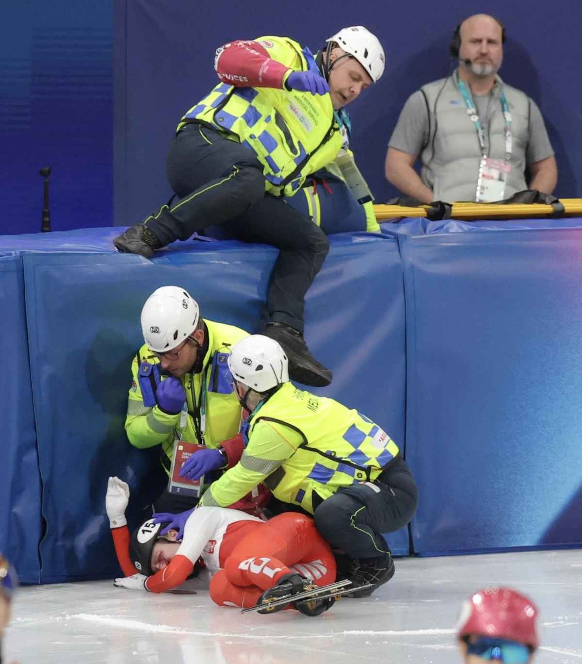 場内騒然 ショートトラックで衝撃事故 3人もつれて転倒、ポーランド選手の目付近に他選手のスケートの刃が直撃、ゴーグル吹き飛ぶ 動けず担架で搬送 SNSも「あと数ミリで」「本当に命がけ」