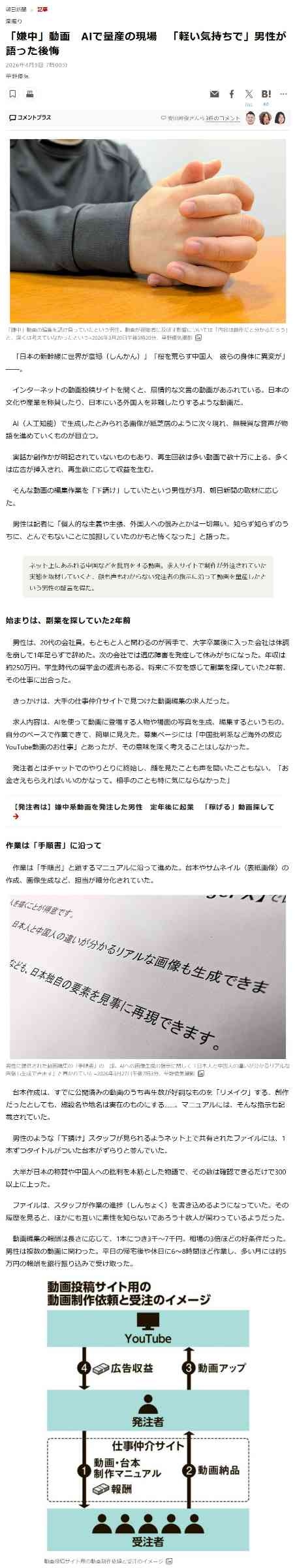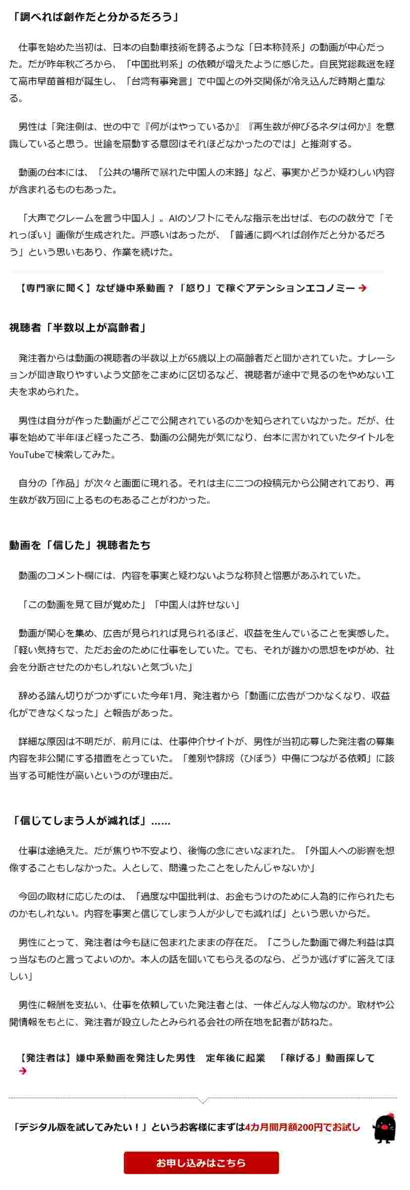 「嫌中」動画 AIで量産の現場 「軽い気持ちで」男性が語った後悔:朝日新聞https://digital.asahi.com/articles/ASV433CJMV43UTIL02DM.html?ptoken=01KNR6J9ZBGMC4R58P05GTM437