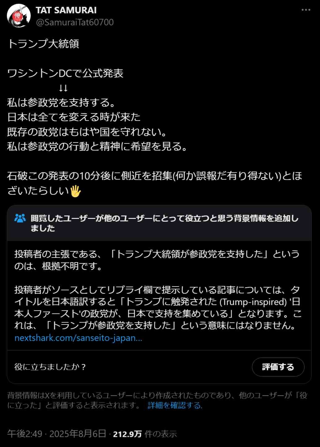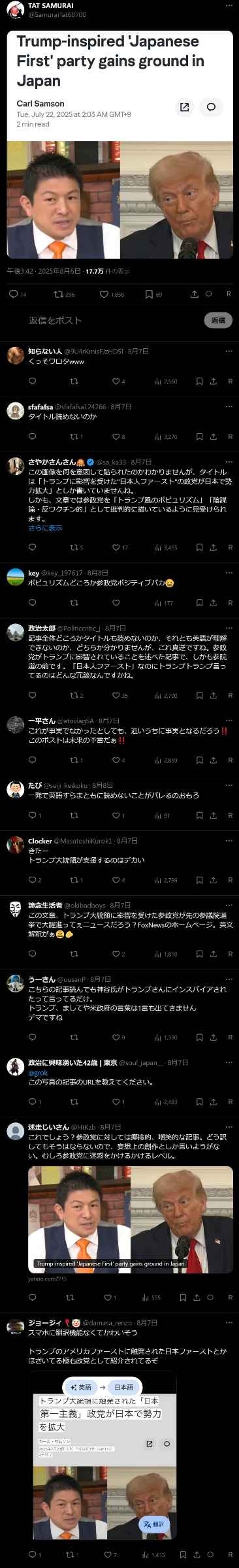 愛国者「トランプ大統領がワシントンDCで公式発表。私は参政党を支持する。私は参政党の行動と精神に希望を見る」⇒参政党信者「うおおおお!」3.5万いいね