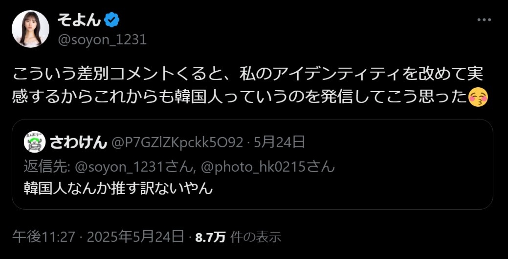 日本の恥ネトウヨ、日本生まれの韓国人タレントに「韓国人なんて推すわけないやん」とコメント⇒タレントに珍獣扱いされてしまう