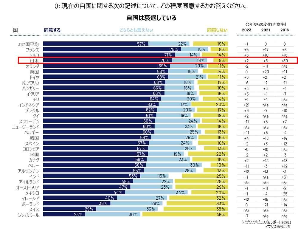 「自国は衰退している」と感じている日本人は70%だが、これは調査対象となった31カ国中でフランス、トルコに次いで3番目に高い数値で、31カ国の平均(57%)を大きく上回っている。9年間で30ポイント増加したが、それだけ自国に対して悲観している日本人が多いことを示した。同時に質問した「既存の政党や政治家は、私のような人間を気にかけていない」と感じている日本人の割合は68%で、これも2016年の調査時(39%)と比べて29ポイント増加している。「自国の社会は崩壊している」と感じている日本人は53%と31カ国中21番目ながら、2016年調査時の31%から22ポイント増加した。これは他国と比べ最も高い増加率となっている。