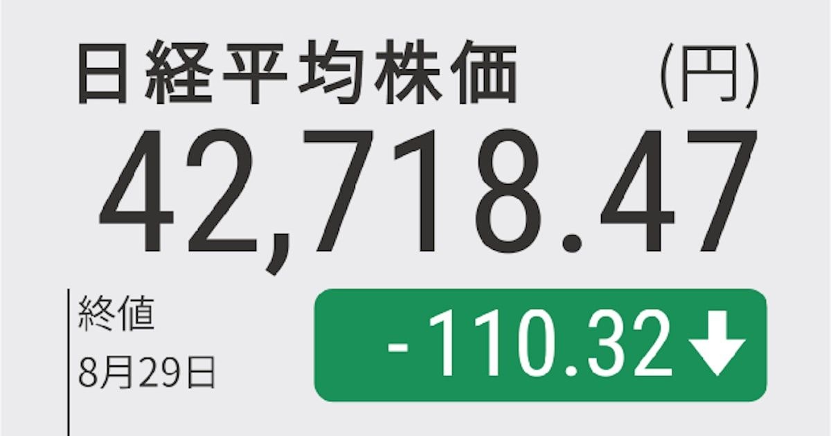 29日の東京株式市場で日経平均株価は3日ぶりに反落し、前日比110円32銭(0.26%)安の4万2718円47銭で終えた。