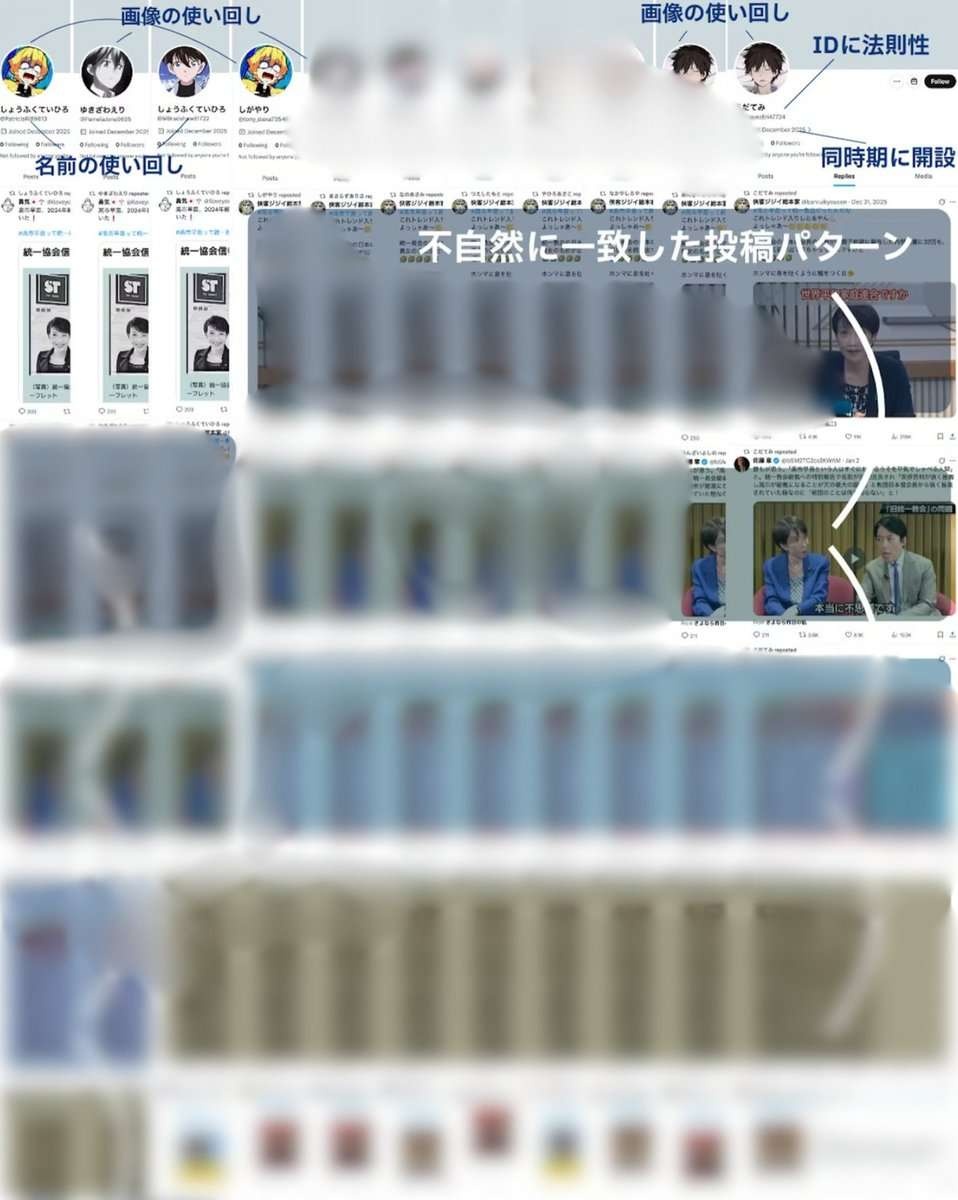 >中国系の工作アカウント群の投稿は、主に世界平和統一家庭連合(旧統一教会)と首相に関する内容が多い。@