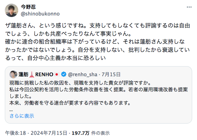 - 蓮舫は自分を連合が支持しないから衰退しているなんて一言も言ってない