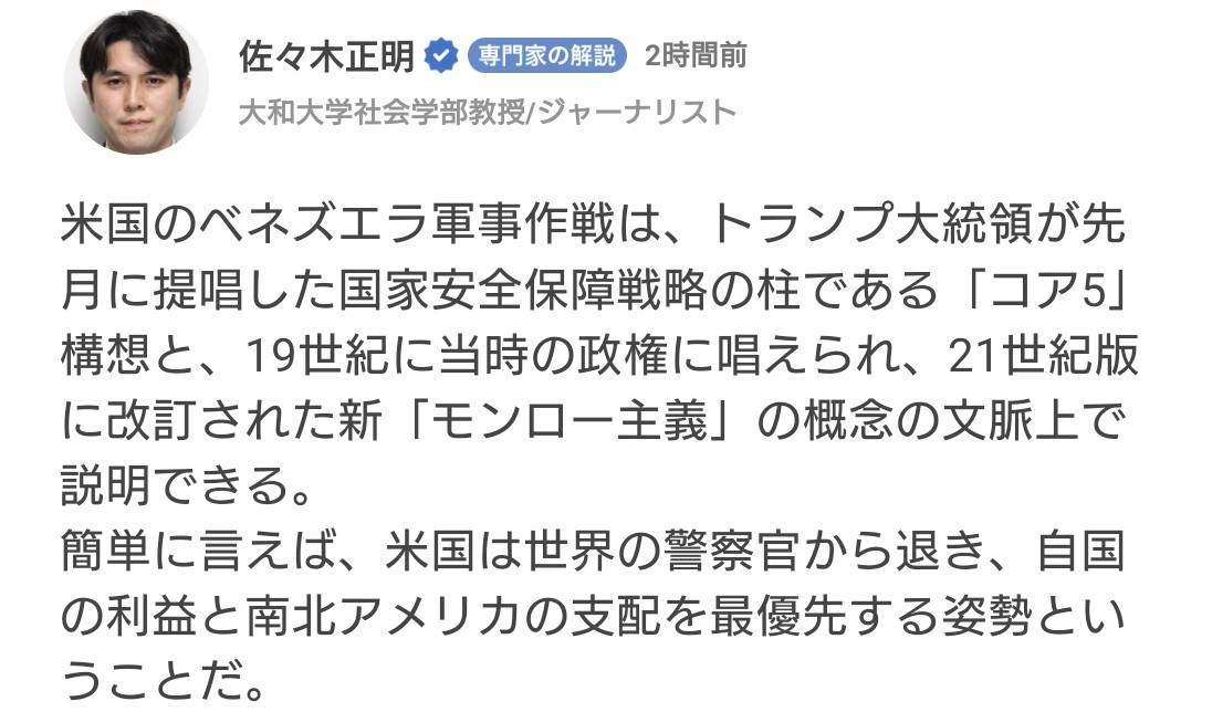 パワープレイなんかじゃなくて国際法で明確に禁止されてる「武力による現状変更」なんだから賛否両論もクソもなくて否定しか無いんだよ。 - 7 : 2026/01/05 00:09:01 FkE83
