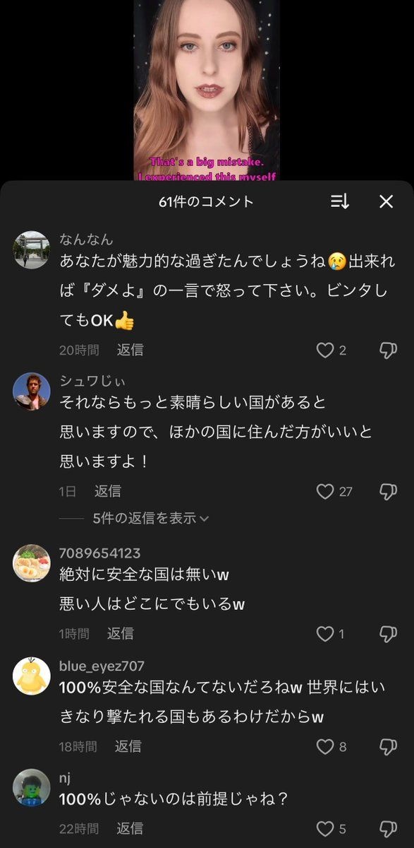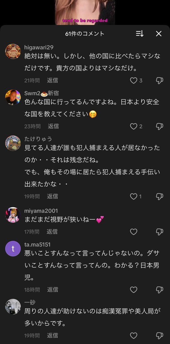 「日本は安全っていうけど違う、街中で堂々と痴漢されても誰も助けてくれない。いろんな国行ったけどこんなのは初めて」