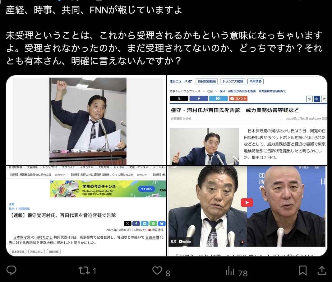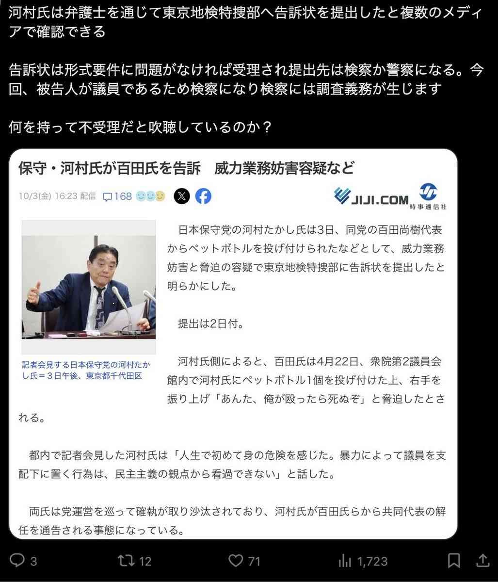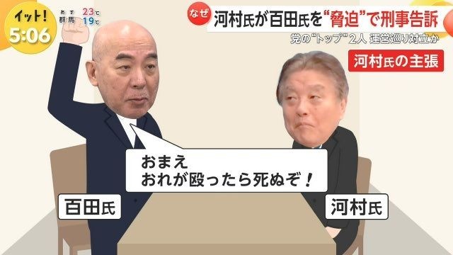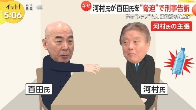河村氏側によると、百田氏は4月22日、衆院第2議員会館内で河村氏にペットボトル1個を投げ付けた上、右手を振り上げ「あんた、俺が殴ったら死ぬぞ」と脅迫したとされる。