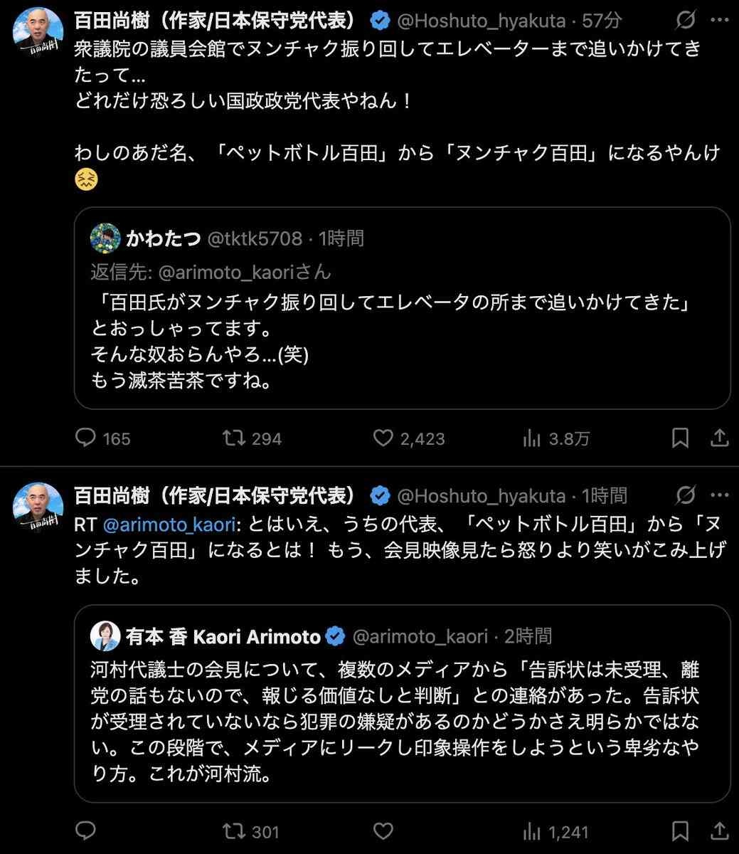 党の会見で記者に党大会や党首選挙のことを聞かれて、河村が両方やると言ったら百田が勝手なこと言うなと記者たちの前でケンカになった それでその後の話し合いで百田がでペットボトル投げつけたり脅したりと報道されてる