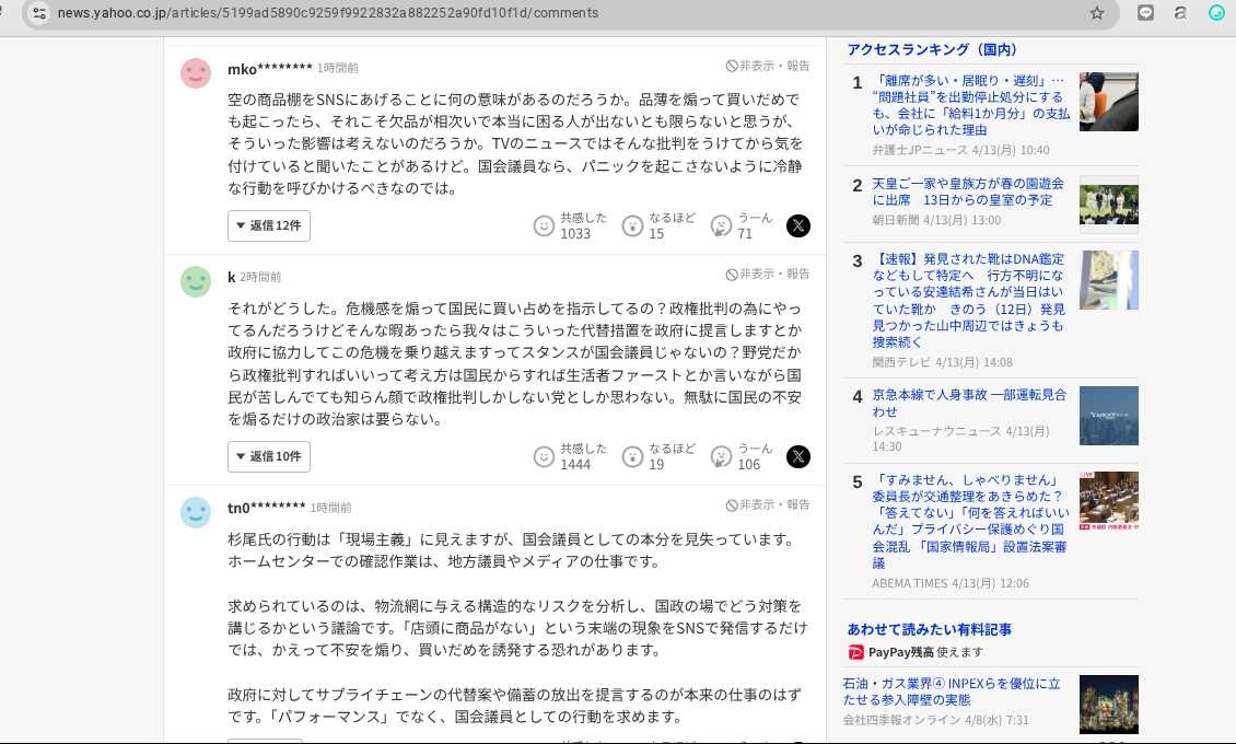 立憲杉尾議員 ホームセンターでの品薄事情を報告したところ、案の定「不安を煽るな」とネトウヨ勢が狂ったように猛攻撃開始
