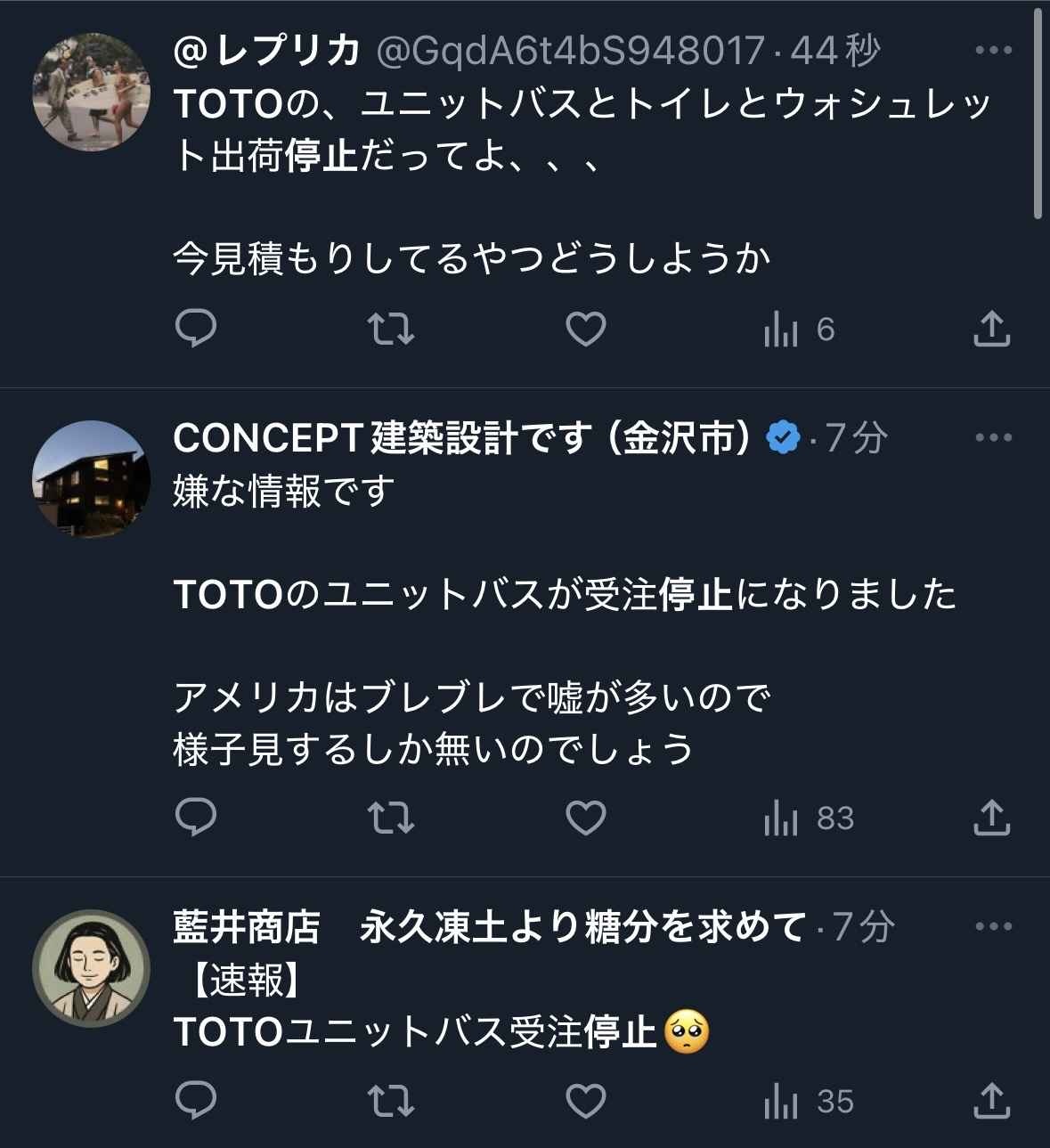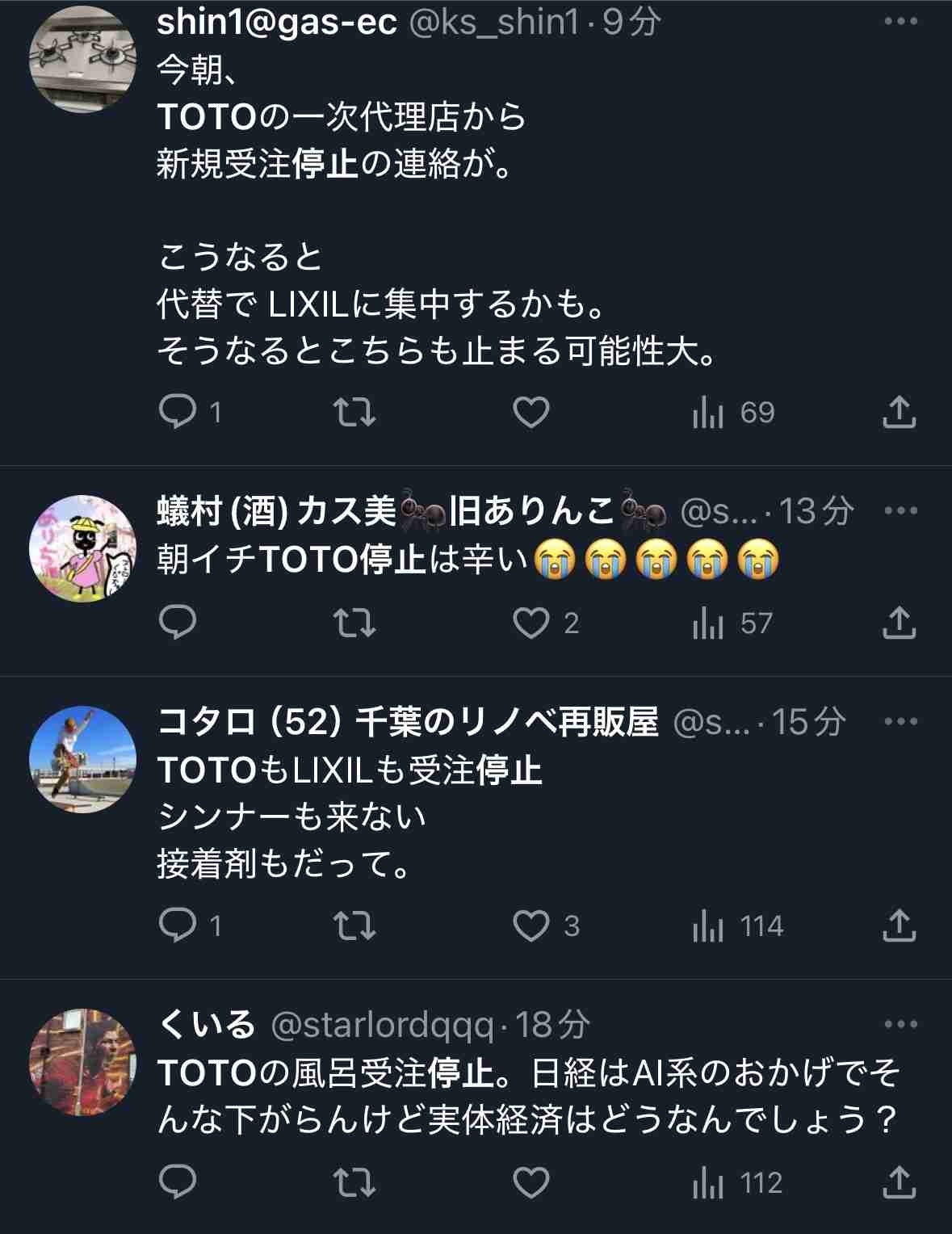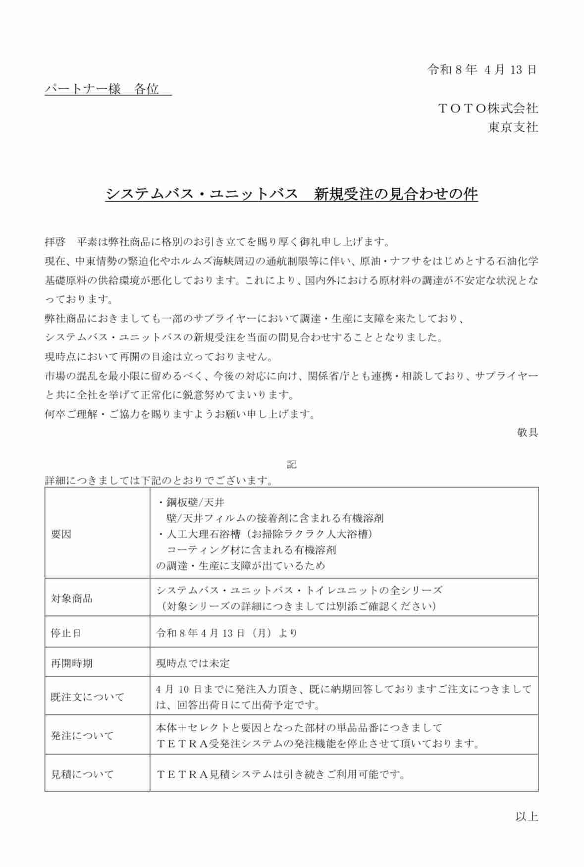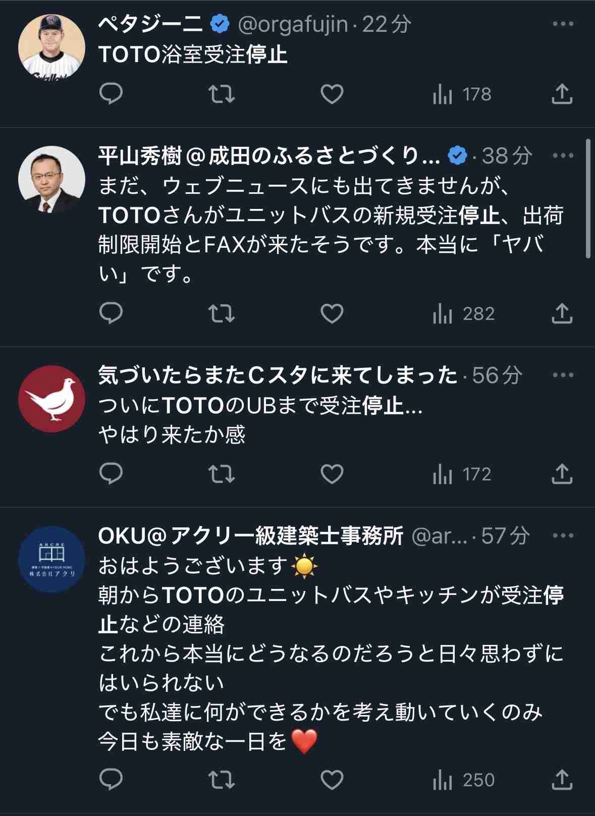 肥料、テープ全種類、TOTOユニットバス・システムバス・トイレ受注停止。再開時期未定