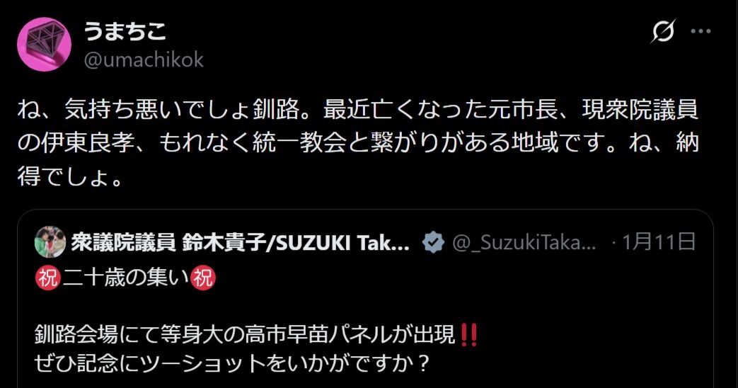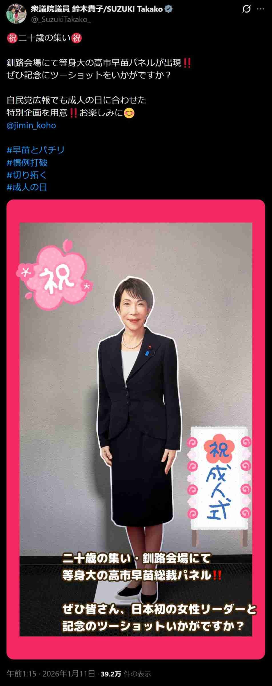 自民党「成人式会場に高市早苗の等身大パネルを設置しました。記念ツーショットにどうぞ」⇒批判殺到