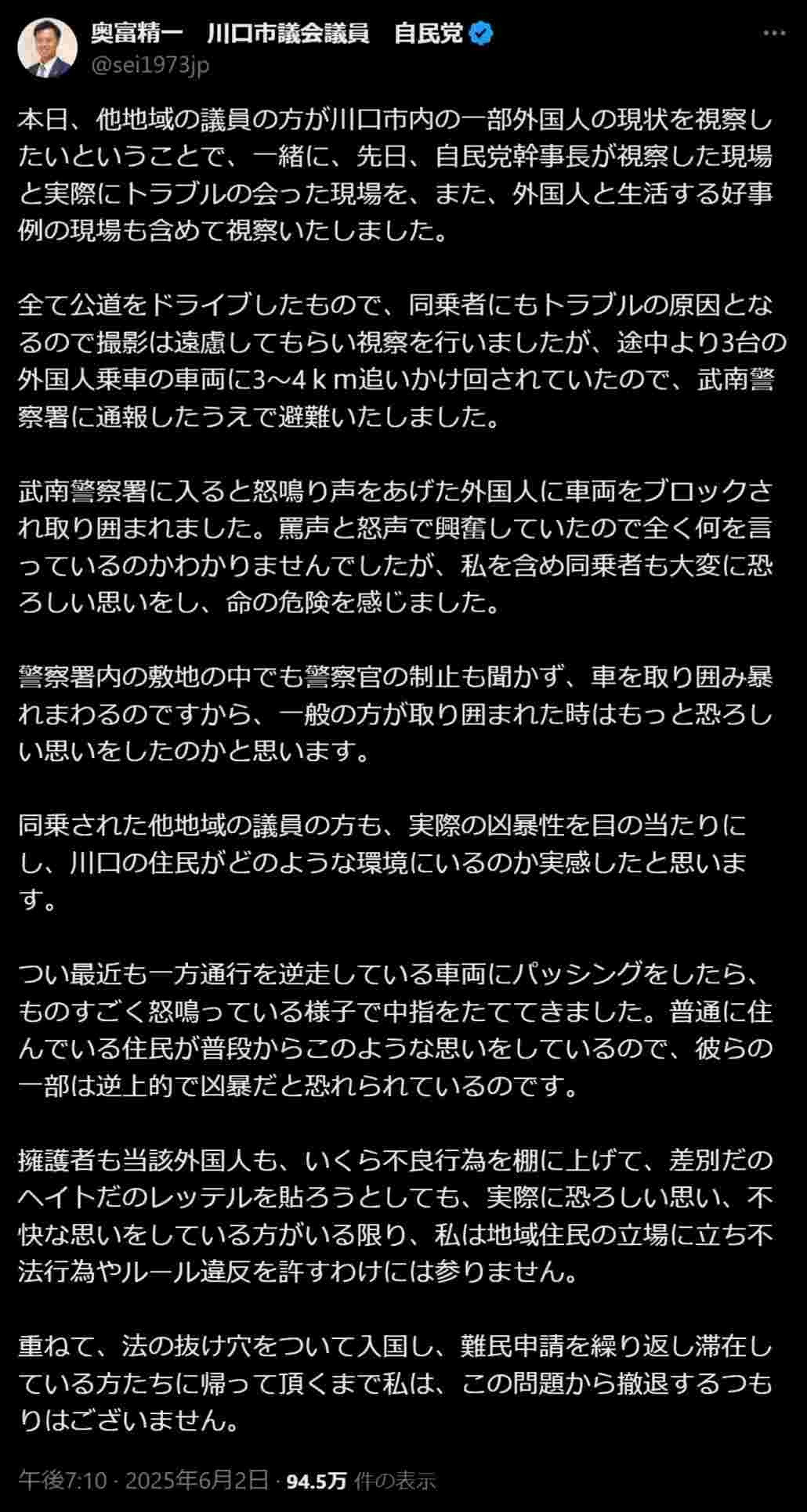 自民議員「川口市を視察するか」⇒怒鳴り散らすクルド人の車数台にブロックされ囲まれる⇒警察沙汰になる⇒クルド人協会「川口に来るなら事前に俺たちの承諾を得ろよ」と発表して炎上