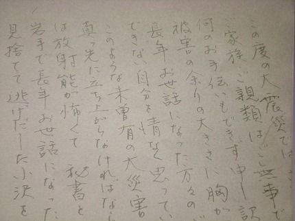 そんな中、三月十六日の朝、北上出身の第一秘書の川辺が私の所へ来て、「内々の放射能の情報を得たので、先生の命令で秘書達を逃がしました。私の家族も既に大阪に逃がしました」と胸をはって言うのです。あげく、「先生も逃げますので、奥さんも息子さん達もどこか逃げる所を考えて下さい」と言うのです。
