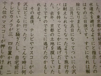 三月二十一日「東京の水道は汚染されているので、料理は買った水でやって下さい」と書生が言いに来ました。しかしそのような情報は一切発表されていませんでしたので、私が「他の人と同じ様に水道水を使います」と言いましたら、それなら先生のご飯は僕達で作りますと断ってきました。