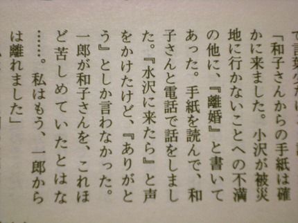 それでも離婚しなかったのは、小沢が政治家としていざという時には、郷里と日本の為に役立つかもしれないのに、私か水をさすようなことをしていいのかという思いがあり、私自身が我慢すればと、ずっと耐えてきました。