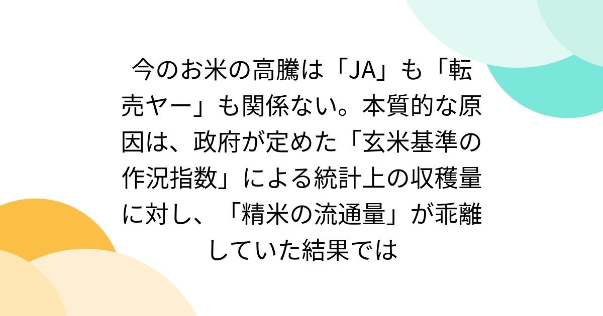 識者「今のお米の高騰は「JA」も「転売ヤー」も関係ない。本質的な原因は、政府が定めた「玄米基準の作況指数」による統計上の収穫量に対し、「精米の流通量」が乖離していた結果では」