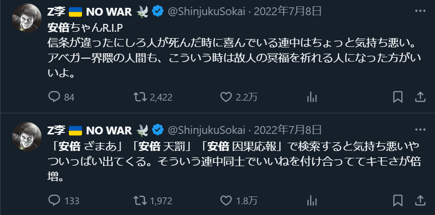冥福はマジで祈ってる日本を棄損した恨みはあるから叩き続けるけどな