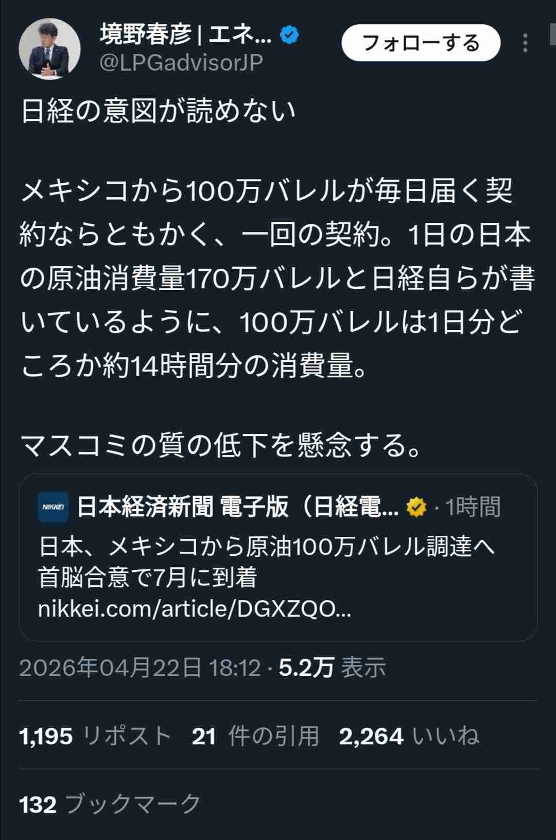 メキシコから100万バレルが毎日届く契約ならともかく、一回の契約。1日の日本の原油消費量170万バレルと日経自らが書いているように、100万バレルは1日分どころか約14時間分の消費量。