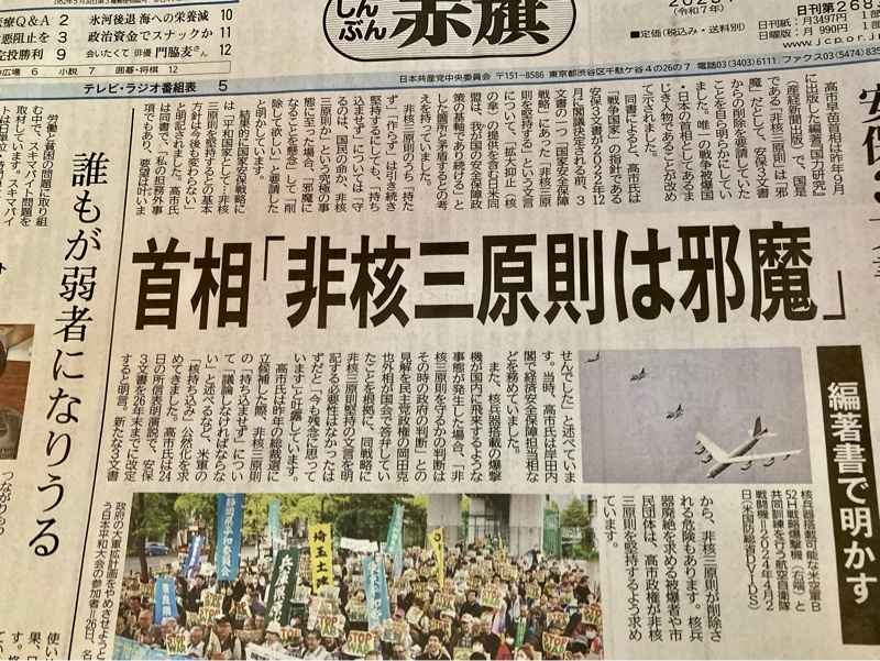 高市早苗首相は昨年9月に出版した編著『国力研究』(産経新聞出版)で、国是である「非核三原則」は「邪魔」だとして、安保3文書からの削除を要請していたことを自ら明らかにしていました。唯一の戦争被爆国・日本の首相としてあるまじき人物であることが改めて示されました。
