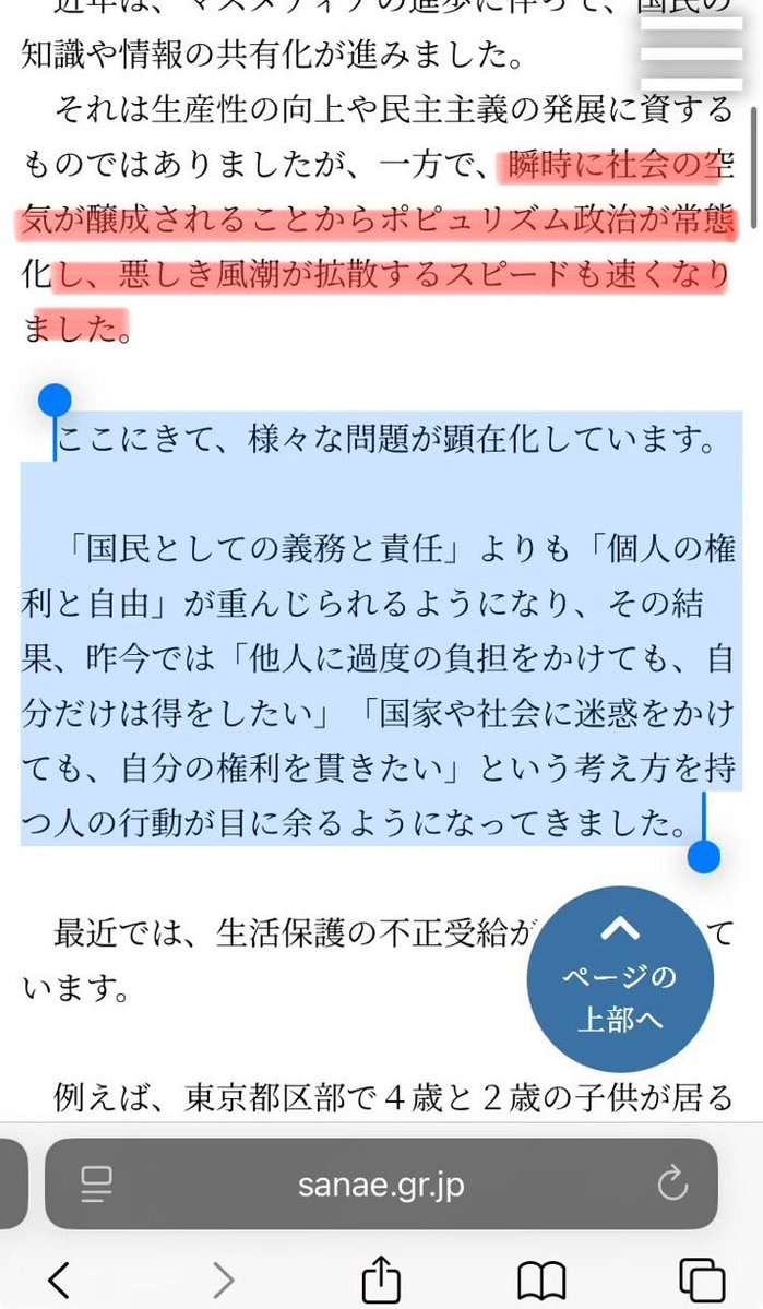 「美しく強い日本」へ②:自立と勤勉の倫理高市「瞬時に空気が作られるポピュリズム政治が常態化して悪しき風潮がスピードアップして拡散してるんやけど!」