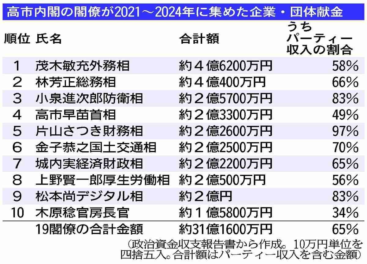 高市内閣の全閣僚4年間で企業・団体献金31億1600万円/65%がパーティー収入 | しんぶん赤旗調べ