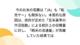 talk嫌儲 識者「今のお米の高騰は「JA」も「転売ヤー」も関係ない。本質的な原因は、政府が定めた「玄米基準の作況指数」による統計上の収穫量に対し、「精米の流通量」が乖離していた結果では」