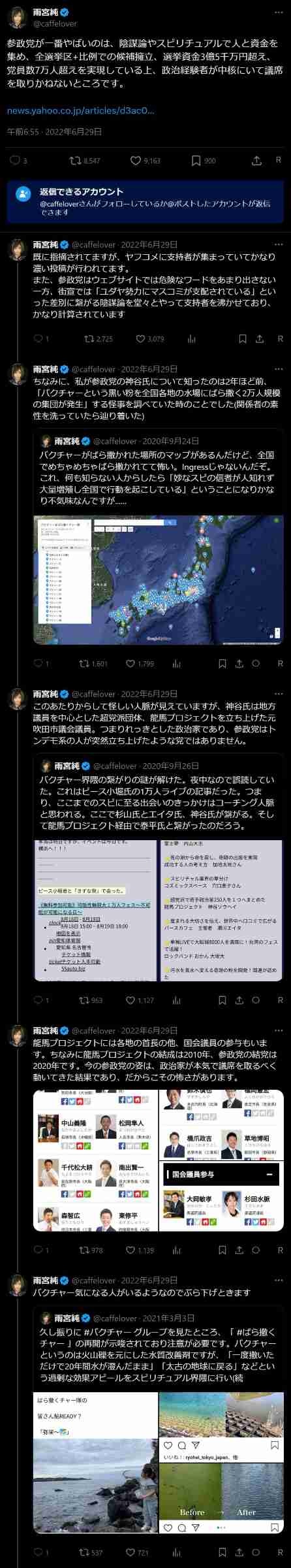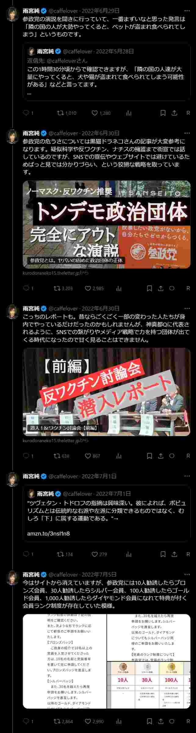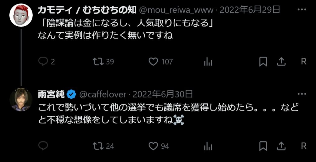 雨宮は陰謀論やマルチ商法、黒猫は子宮系とかスピリチュアル方面のヲチをもともとやってきた人なんで、とうとう政治がそこらの怪しい団体レベルに堕ちたってことか