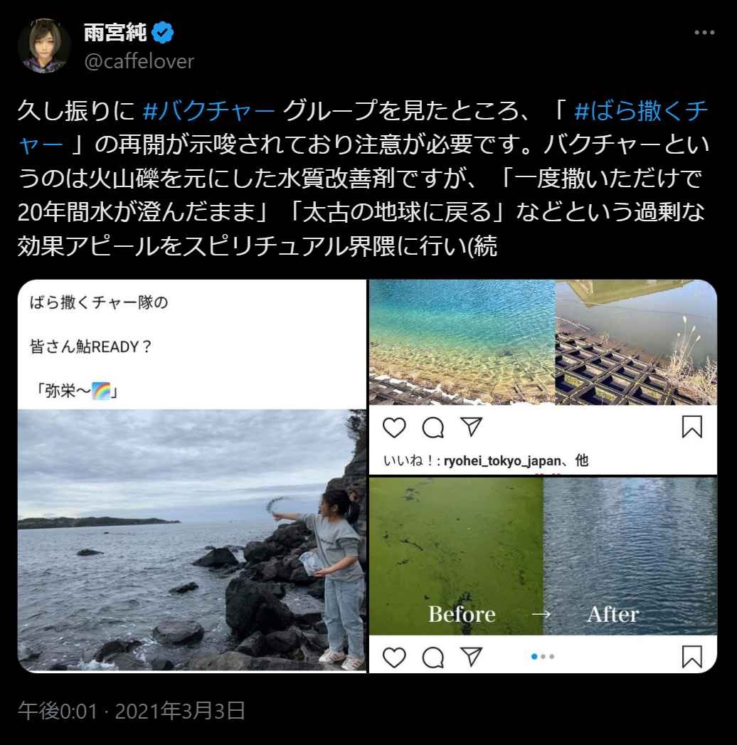 海がキレイになったらなぜか20年前に一度だけ撒いたバクチャーのおかげになるという信者思考怖い