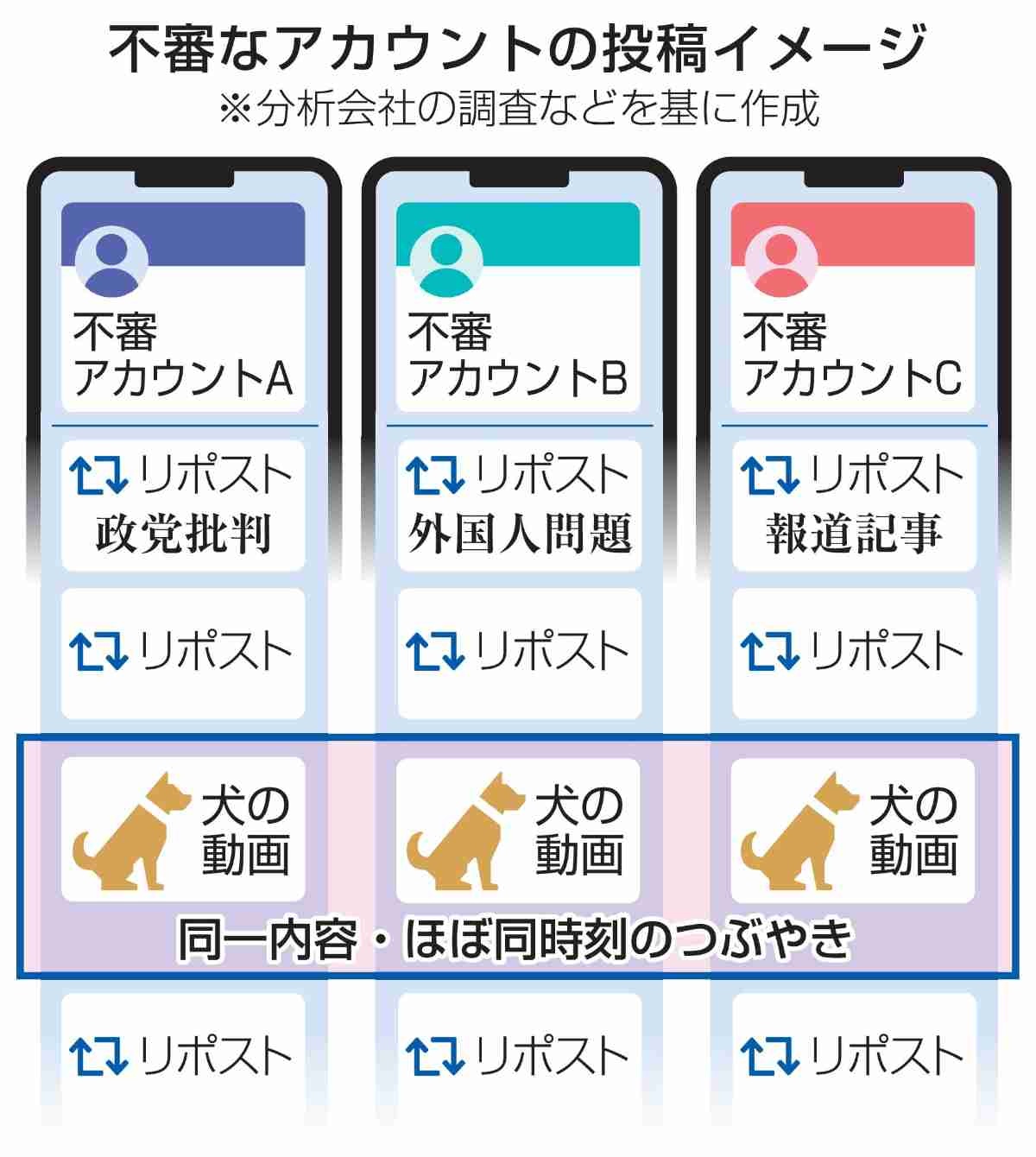 70アカウントが組織的拡散 特徴共通、世論介入か