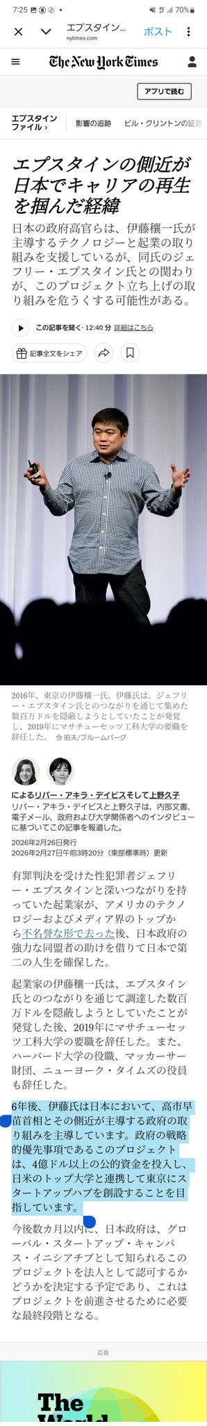 NYタイムズ「エプスタイン文書に出てくる伊藤穰一を政府のプロジェクトに入れてるのは高市早苗」