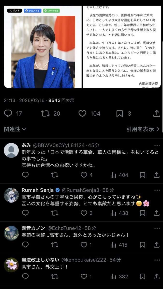 - 高市が春節にお祝いメッセージ出した件でネトウヨは右往左往