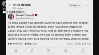 talkニュー速+ 【SNS】トランプ氏 アメリカ産のコメの輸入拡大しない日本に対しSNSで不満