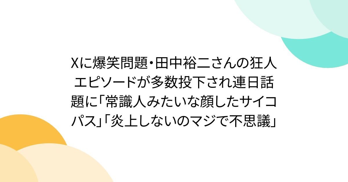 Xに爆笑問題・田中裕二さんの狂人エピソードが多数投下され連日話題に「常識人みたいな顔したサイコパス」「炎上しないのマジで不思議」爆笑問題の田中裕二は猫・野球・競馬にしか興味を示さない一風変わった人物とされる。太田は常識的で穏やか、田中は時折異様な一面を見せ目つきが変わると怖さを覚えるという話がある。「ウーチャカ」と呼んでほしいと突然言うエピソードや学生時代の自作ラジオを車内で流した逸話など、狂気めいた個性が語り継がれ、炎上しない不思議さも指摘さ...togetter.com続き